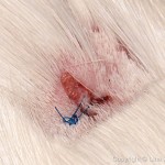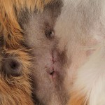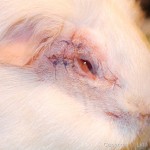 En af mine hunner, der fik rockerbank af en anden hun. Hun mistede en luns i ryggen og blev bidt omkring øjet. Hun var ganske sølle efter dette, men hun kom sig… dog var hun et stykke tid om at genvinde tilliden til de andre marsvin igen.